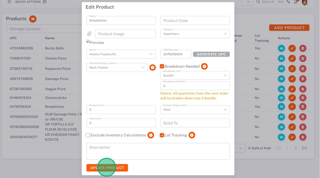 m. OPTIONAL: Check Breakdown Needed to break down the product into smaller units automatically after receiving an order.